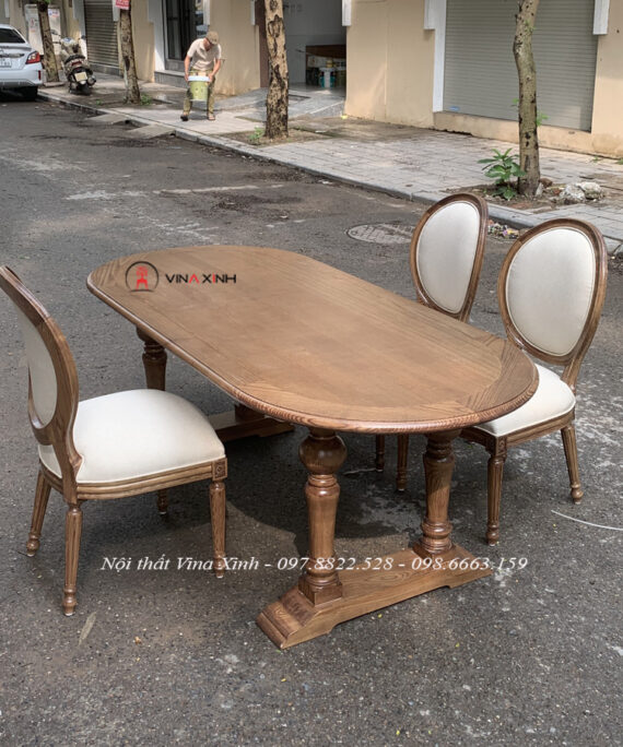 – Mặt bàn bầu dục, mặt long khuân tranh, chất liệu gỗ tần bì, chân trụ.